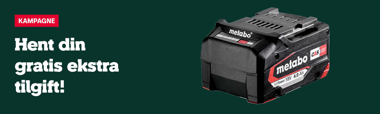 For udvalgte akku-elværktøjer (kampagneværktøjer)* fra Metabo, der købes og registreres inden for kampagneperioden fra den 01.09.2025 til og med den 31.03.2026, får du gratis tilsendt et Metabo 18 V LiPOWER batteri 4,0 Ah – så længe lager haves.