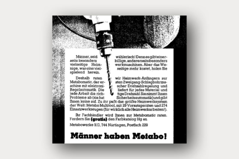 Året 1967 bringer mange forandringer og betydelige begivenheder: Farvefjernsynet afløser billedet i sort/hvid - og Metabo præsenterer det nye Multitool-katalog med 29 forsatsapparater og 274 indsatsværktøjer. Det nye slogan "Mænd bruger Metabo" passer ind i denne tid og til kunderne: Håndværket er et mandsdomineret domæne, kvinder befinder sig i mange virksomheder højest på kontoret.